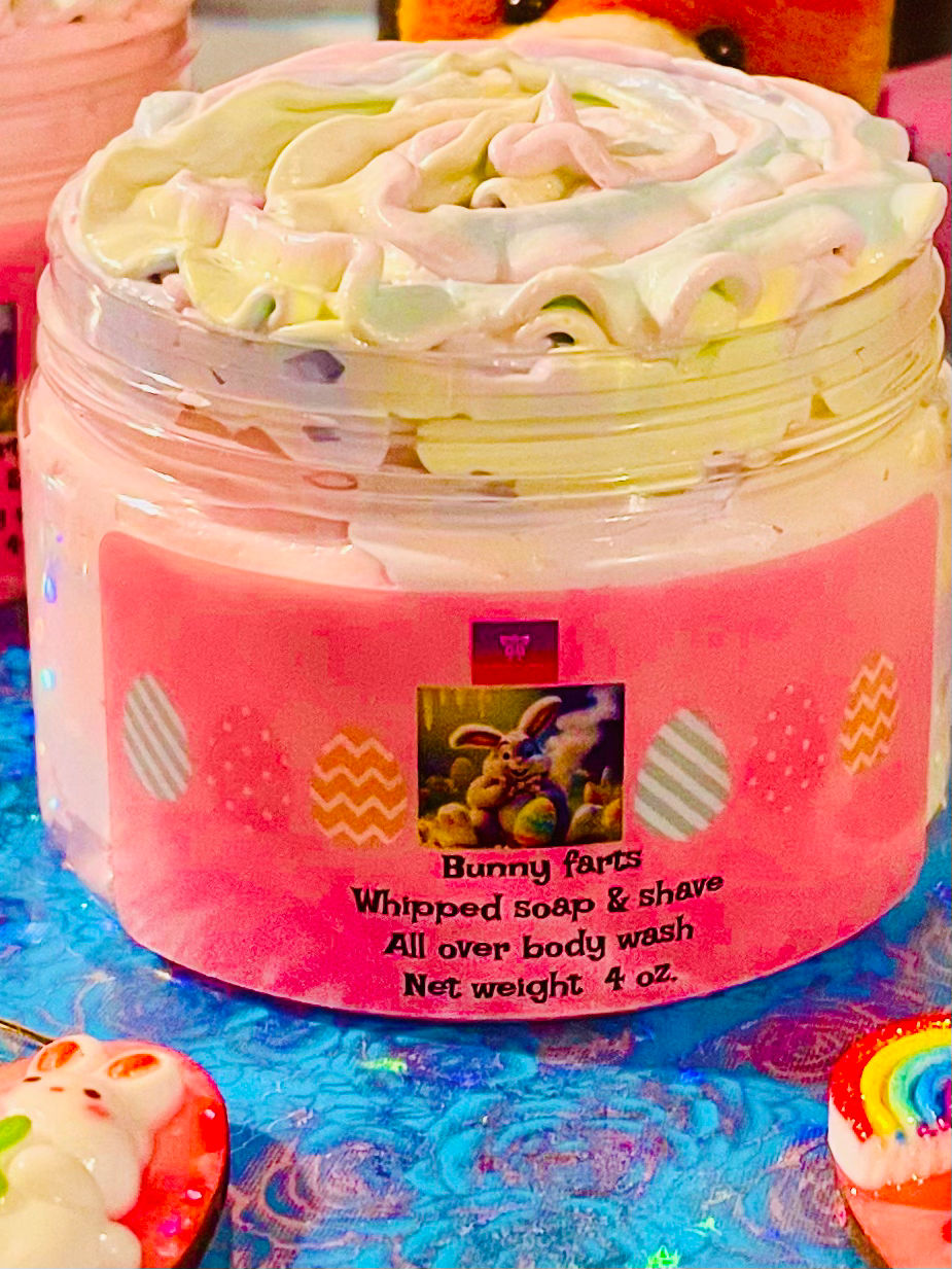 But wait, there’s more! We also have delightful Easter bunny farts whipped soaps! Imagine the bright and cheerful scent of cotton candy bubblegum filling your space. It’s a fun and playful fragrance you will love to add to your bathing regimine! This will surely bring a smile to your face and a little goes a long way!